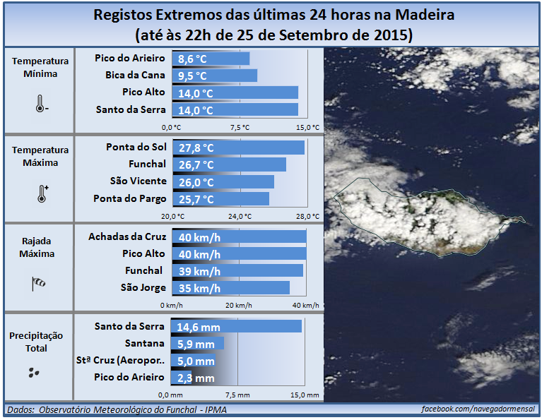 25Set2015: Hoje as temperaturas máximas não foram além dos 27,8ºC na Ponta do Sol. Santo da Serra registou a maior precipitação com um total de 14,6mm, sendo que deste valor, foi registado 8,7mm em apenas uma hora (entre as 21h e as 22h).