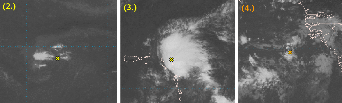 (4.) Uma onda tropical próxima à costa africana, vem registado aguaceiros e trovoadas, prevê-se que possa gradualmente adquirir características tropicais em especial a partir do início da próxima semana. Nos próximos 5 dias há uma possibilidade média de 40% de evoluir para um sistema tropical.