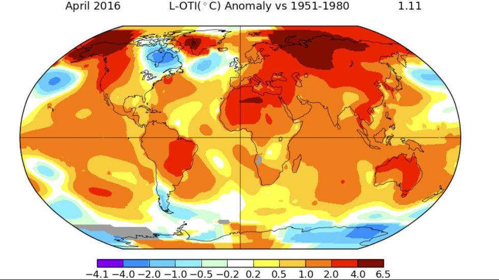19Maio2016: O mês passado, foi o mês de Abril mais quente desde 1880 em todo o mundo, segundo dados da NASA. Este mês ficou 1,11ºC acima da média 1951-1980. Desde 1880 os meses mais quentes foram (temperatura acima da média):