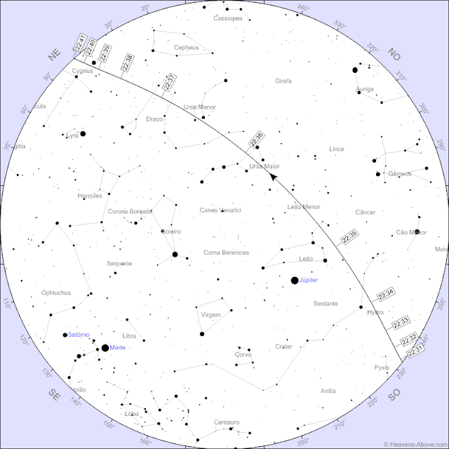 Irá surgir próximo do horizonte sudoeste pelas 22h34 e desaparecer a nordeste pelas 22h38.