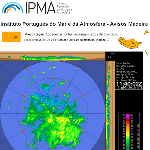 O IPMA elevou para aviso laranja de chuva ou aguaceiros por vezes fortes com possibilidade de trovoadas. Na imagem de radar é visível a leste da Madeira, em aproximação da Região, de nuvens convectivas com precipitação.